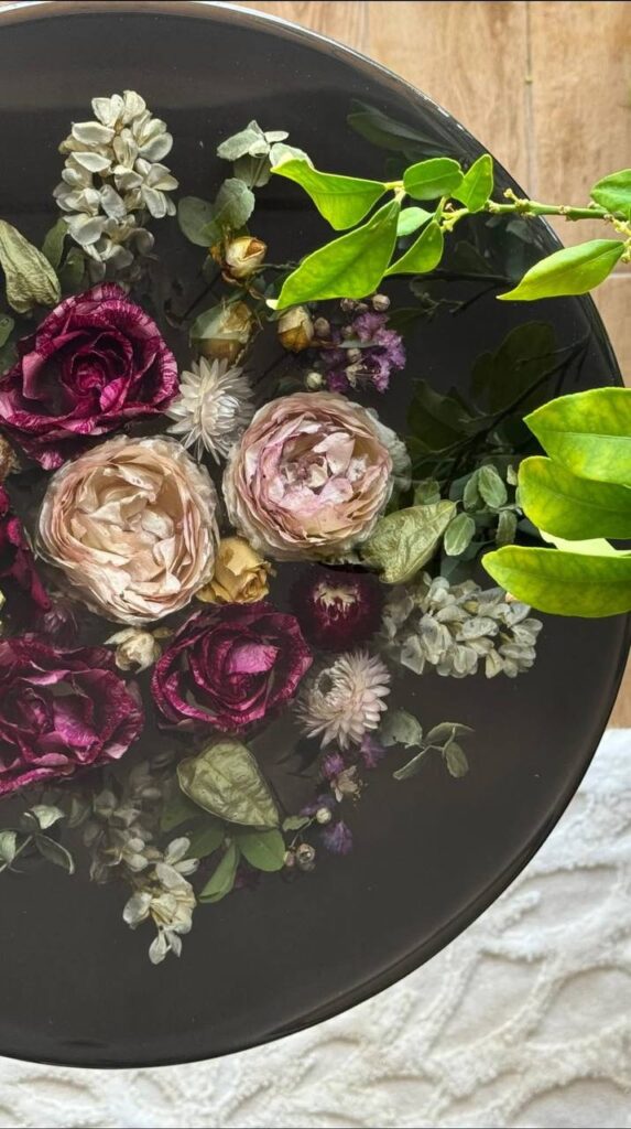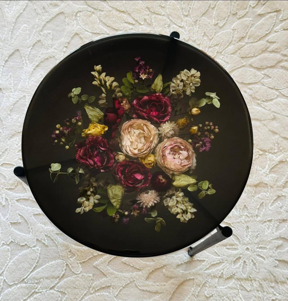 Класика и страст, вплетени в изящен дизайн. Червените и розови рози, символи на любов и елегантност, изпъкват върху дълбокочерна епоксидна смола, която им придава драматичност и загадъчност. Контрастът между цветовете създава усещане за изисканост и лукс, а гланцовата повърхност добавя дълбочина и отражение, което променя визията според светлината.