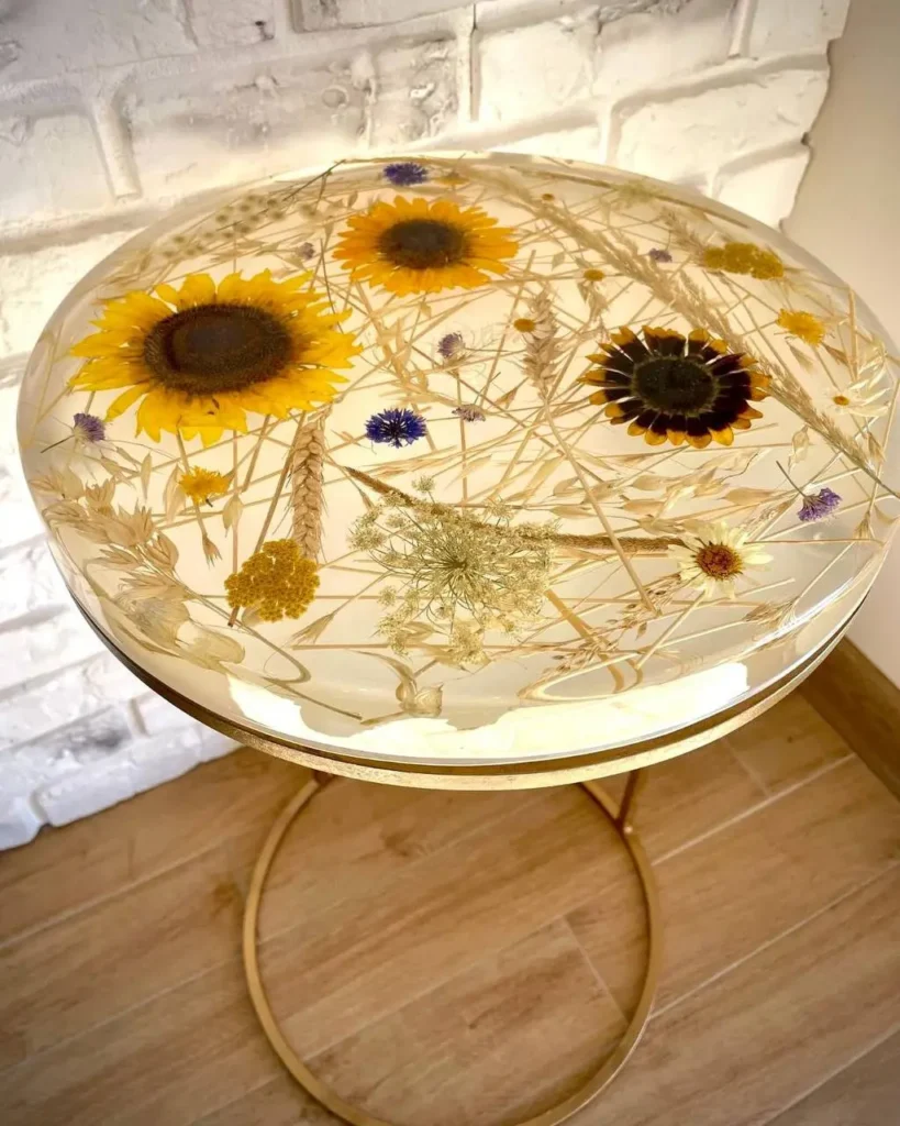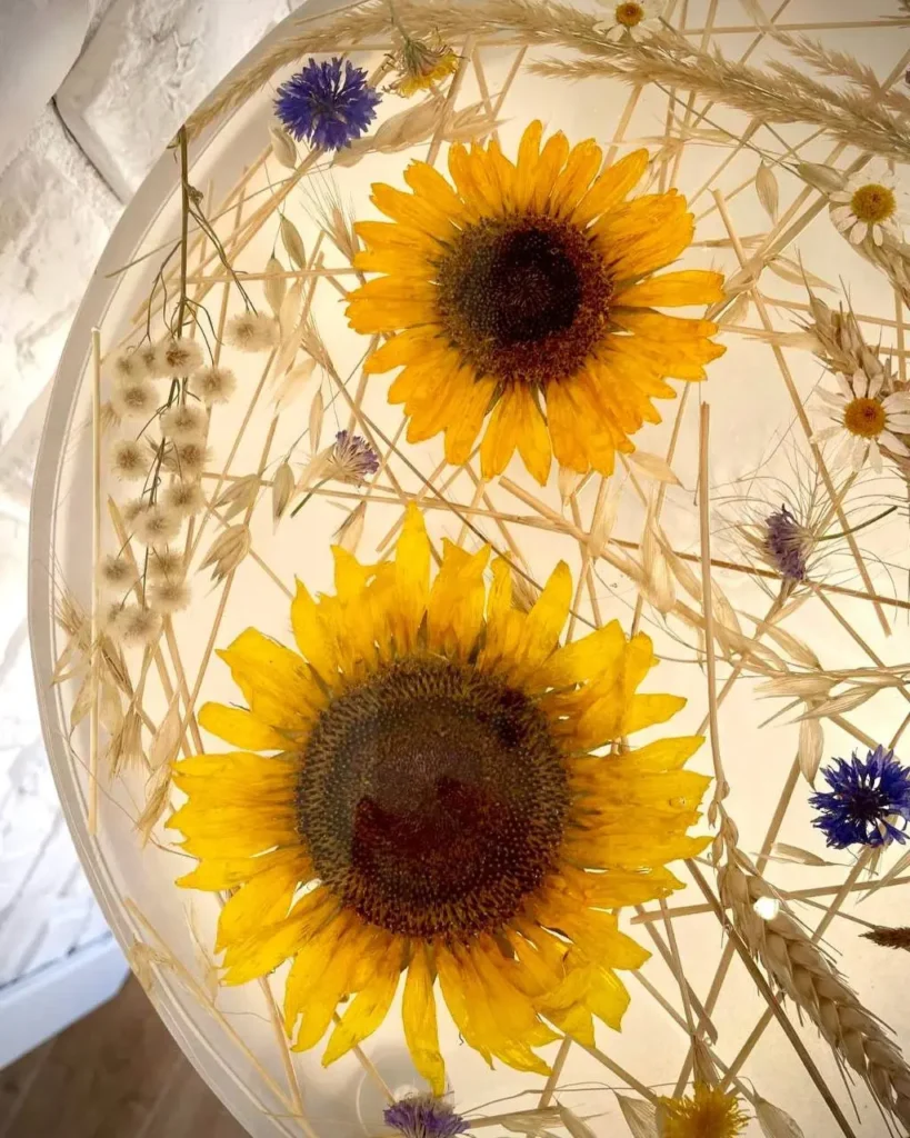 Свежест, топлина и природна красота – тази маса носи усещане за безгрижни летни дни. Слънчогледите греят с ярките си цветове, а полските цветя добавят нежност и естествен чар. Всичко това е запечатано в прозрачна епоксидна смола върху бяла основа, която придава усещане за лекота и простор.